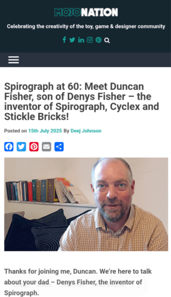 In the meantime, my interview with Deej Johnson of Mojo Nation has just been published and we talk in some depth about Spirograph and my memoir of dad: