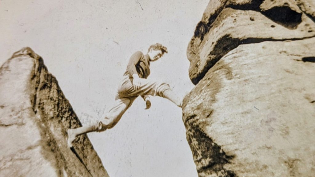 What was going well for Denys at that time, however, was his rock climbing. Dad took to the sport with alacrity after being introduced to it by his university pals, and honed his craft at Almscliffe Crag, the celebrated gritstone outcrop that lies ten miles north of Leeds.